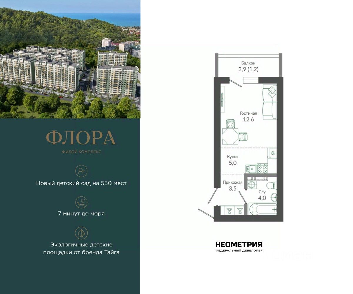 Продается квартира в ЖК "Флора" от федерального девелопера "Неометрия". Это жилой комплекс комфорт-класса в самом зеленом районе Сочи. При проектировании постарались максимально сохранить окружающую флору и фауну. Теплое море, горы, целебные источники, река, близость заповедника все это уже рядом с вами.