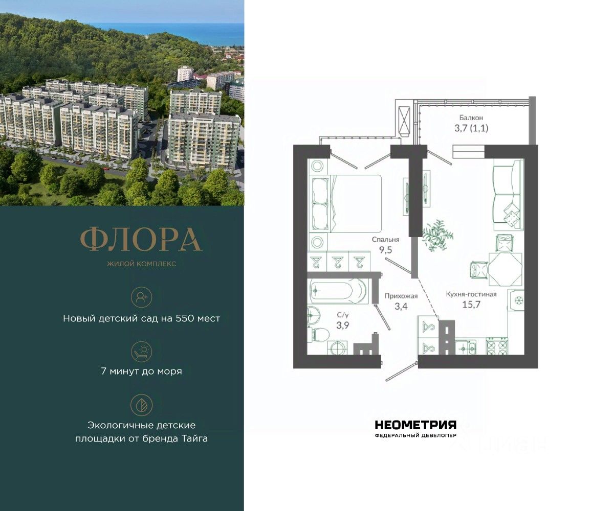 Продается квартира в ЖК "Флора" от федерального девелопера "Неометрия". Это жилой комплекс комфорт-класса в самом зеленом районе Сочи. При проектировании постарались максимально сохранить окружающую флору и фауну. Теплое море, горы, целебные источники, река, близость заповедника все это уже рядом с вами.