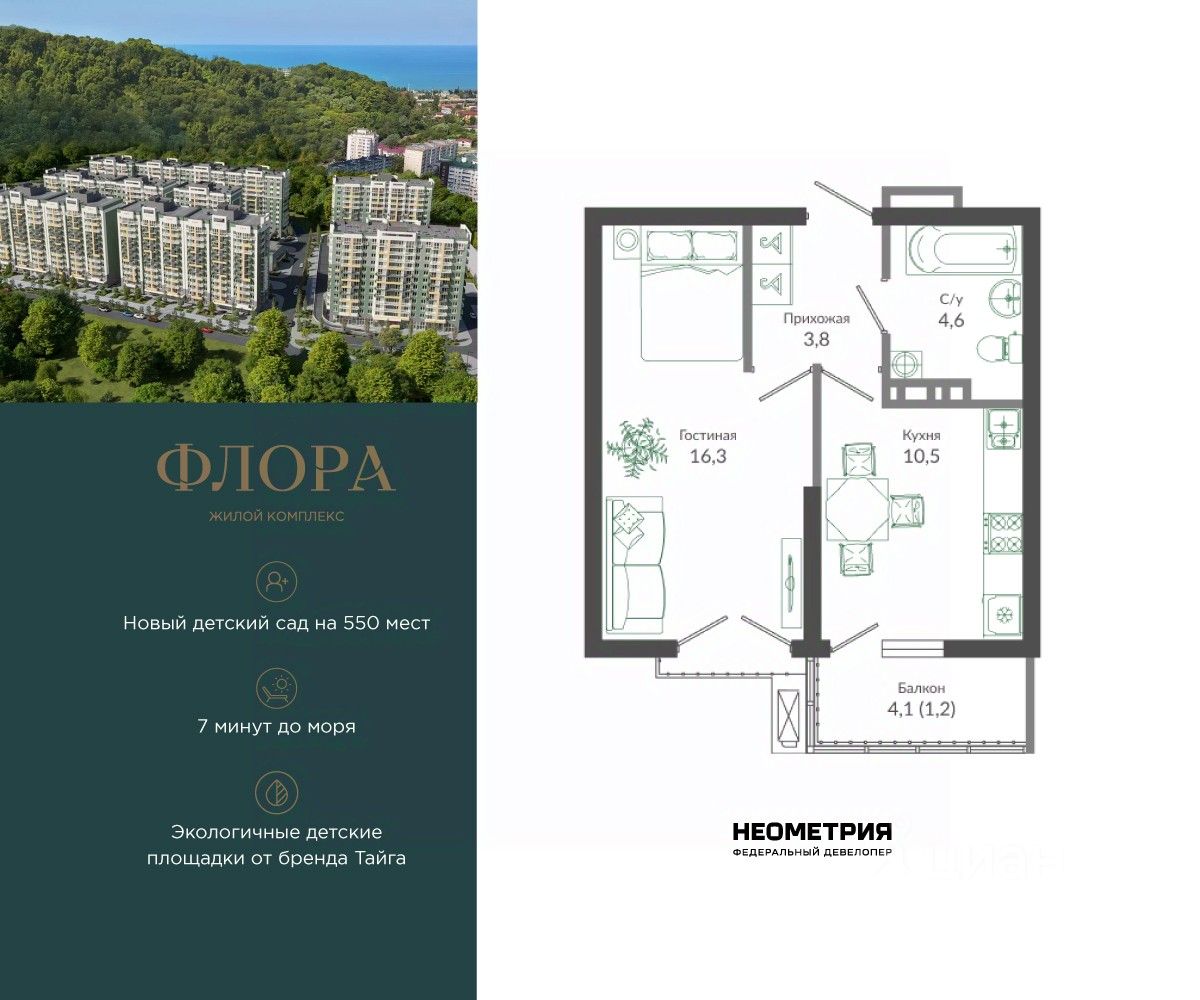 Продается квартира в ЖК "Флора" от федерального девелопера "Неометрия". Это жилой комплекс комфорт-класса в самом зеленом районе Сочи. При проектировании постарались максимально сохранить окружающую флору и фауну. Теплое море, горы, целебные источники, река, близость заповедника все это уже рядом с вами.