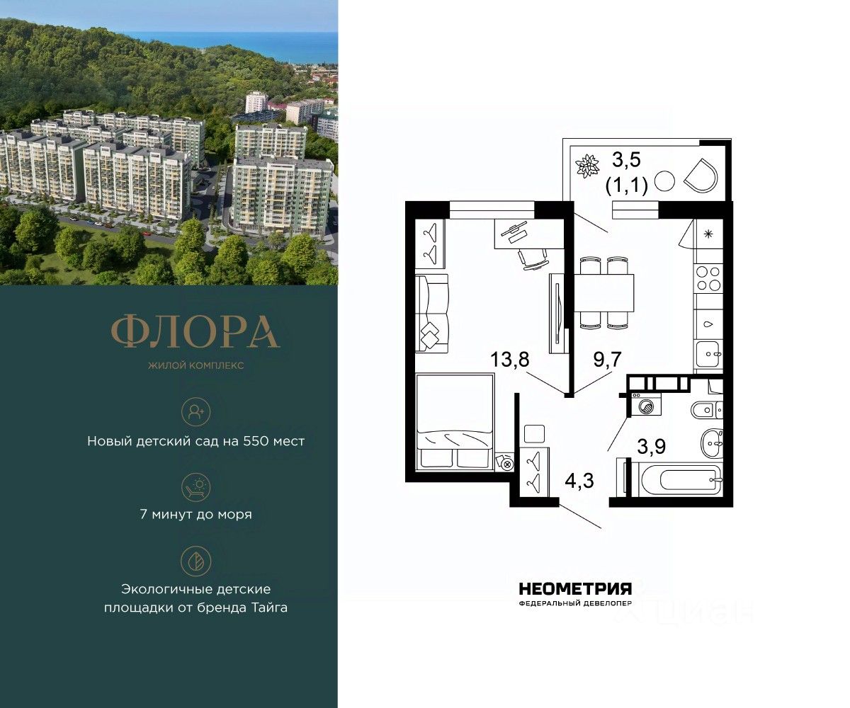 Продается квартира в ЖК "Флора" от федерального девелопера "Неометрия". Это жилой комплекс комфорт-класса в самом зеленом районе Сочи. При проектировании постарались максимально сохранить окружающую флору и фауну. Теплое море, горы, целебные источники, река, близость заповедника все это уже рядом с вами.