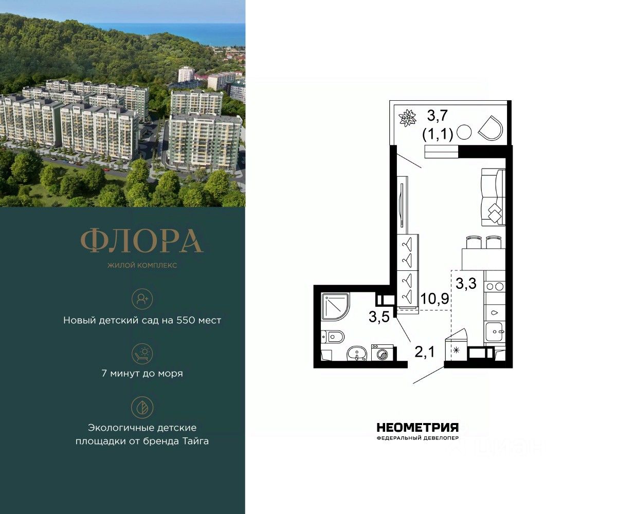 Продается квартира в ЖК "Флора" от федерального девелопера "Неометрия". Это жилой комплекс комфорт-класса в самом зеленом районе Сочи. При проектировании постарались максимально сохранить окружающую флору и фауну. Теплое море, горы, целебные источники, река, близость заповедника все это уже рядом с вами.