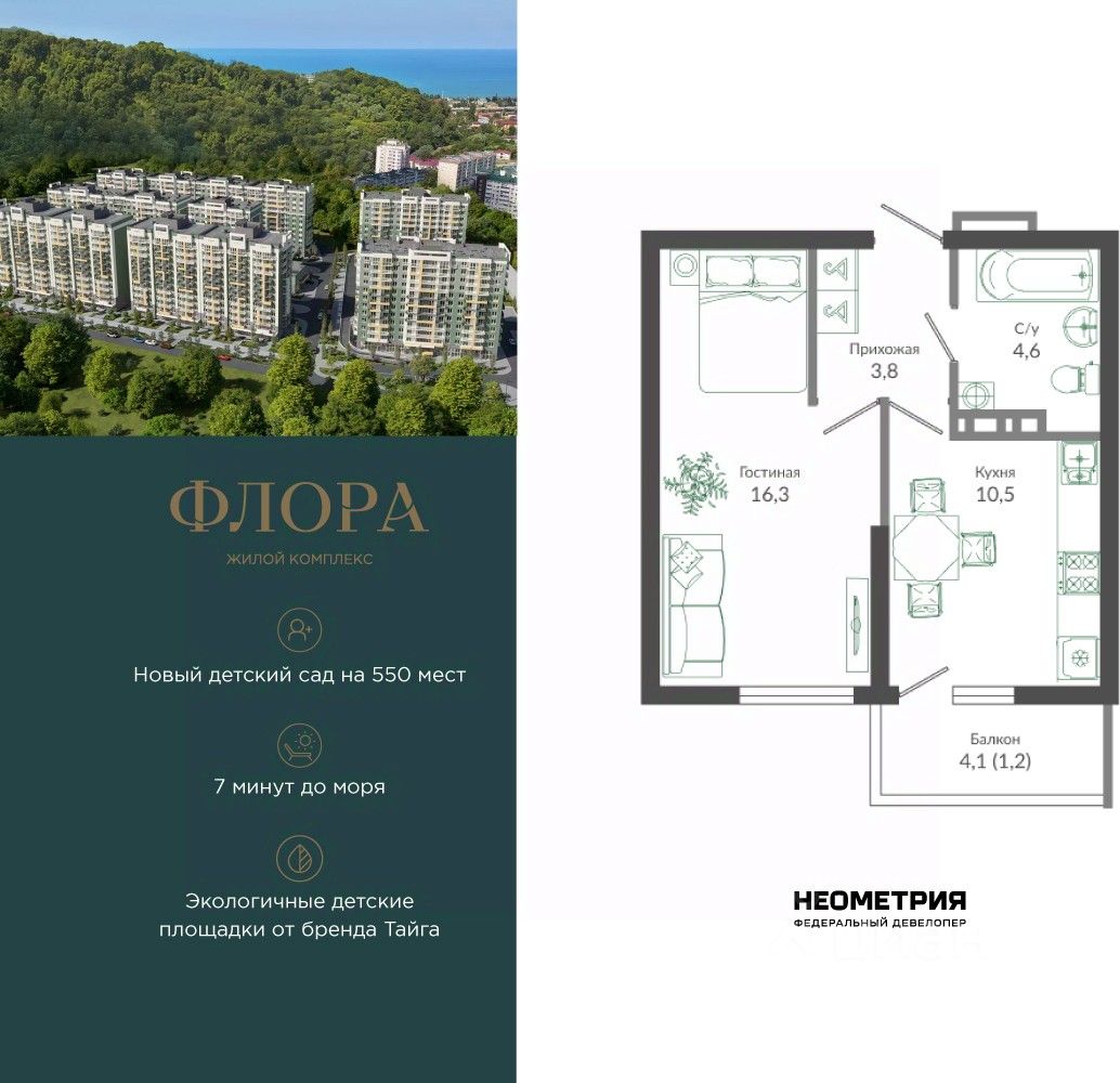 Продается квартира в ЖК "Флора" от федерального девелопера "Неометрия". Это жилой комплекс комфорт-класса в самом зеленом районе Сочи. При проектировании постарались максимально сохранить окружающую флору и фауну. Теплое море, горы, целебные источники, река, близость заповедника все это уже рядом с вами.