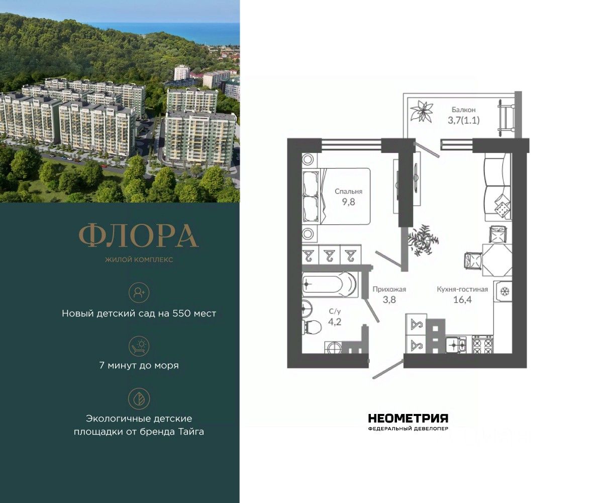 Продается квартира в ЖК "Флора" от федерального девелопера "Неометрия". Это жилой комплекс комфорт-класса в самом зеленом районе Сочи. При проектировании постарались максимально сохранить окружающую флору и фауну. Теплое море, горы, целебные источники, река, близость заповедника все это уже рядом с вами.