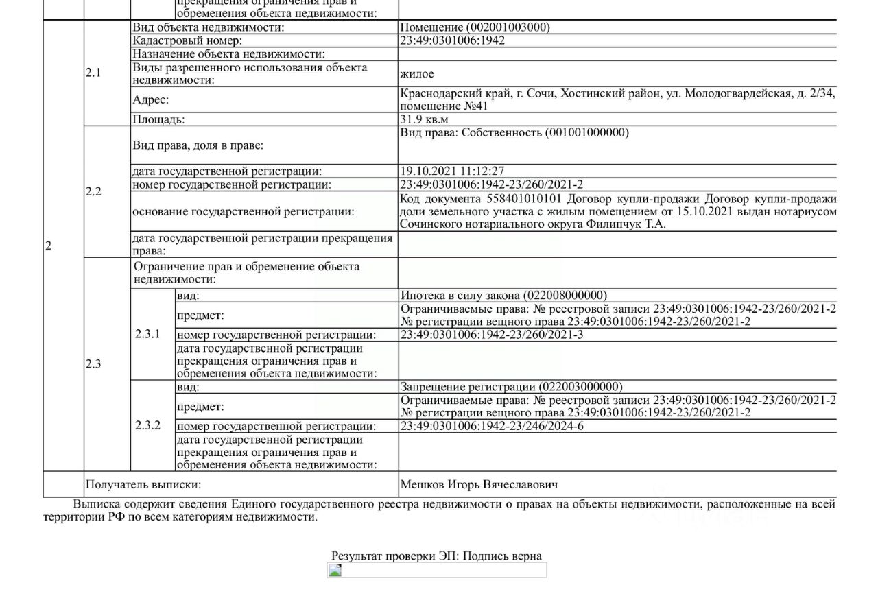 Д-к: Зудина Г.В. Квартира, площадь 31,9 кв.м., кадастровый номер 23:49:0301006:1942. Адрес: Краснодарский край, г. Сочи, ул. Молодогвардейская, д. 2/34, пом. 41. Начальная цена 6 569 478 руб., задаток 6 570 руб., шаг аукциона 65 695 руб., ув. 1768