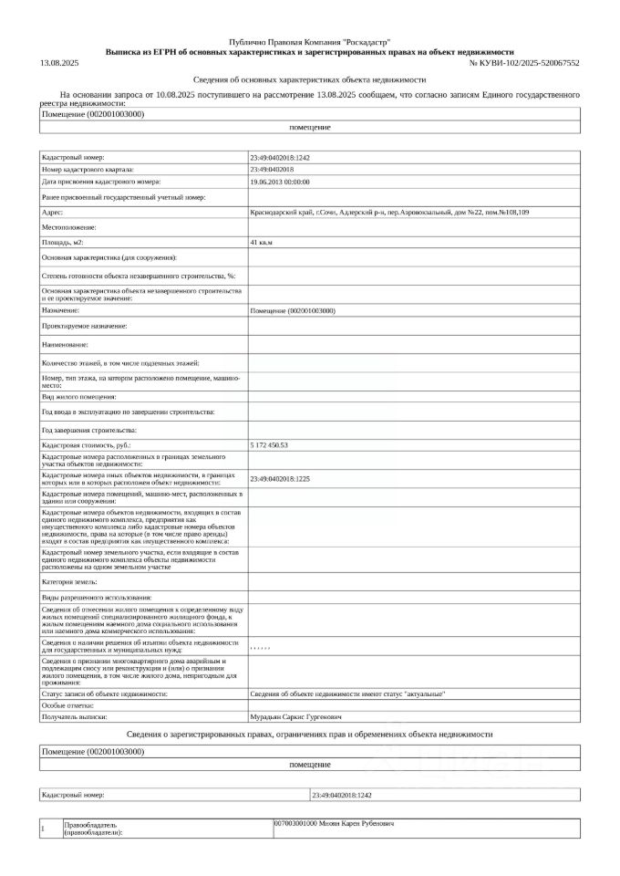Д-к: Мноян К.Р. Помещение жилое, площадь 41 кв.м., кадастровый номер 23:49:0402018:1242. Адрес: Краснодарский край, г. Сочи, Адлерский район, пер. Аэровокзальный, д. 22, пом. 108, 109. Начальная цена 10 327 500 руб., задаток 10 328 руб., шаг аукциона 103 275 руб., ув. 1448