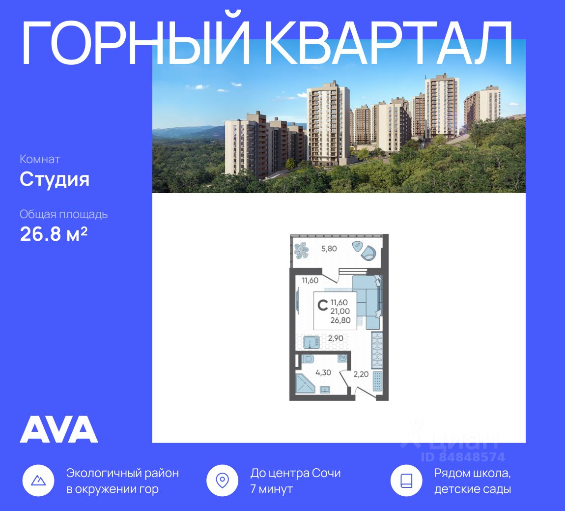 Продается студия в доме (Литер 1), срок сдачи : 3 кв. 2026, общей площадью 26.8 кв.м., на 1 этаже в новом современном жилом комплексе в Сочи "Горный квартал", Хостинский район. Отличный вариант для инвестиций и жизни.
