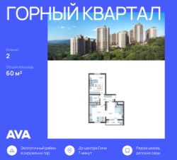 В продаже 2-комнатная квартира площадью 60, расположенная Литер 4 жилого комплекса комфорт+ класса "Горный квартал". Комплекс от девелопера AVA находится в Сочи, Хостинского района, в 15 минутах езды от центра города.