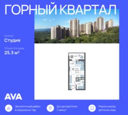 Продается студия в доме (Литер 4), срок сдачи : 3 кв. 2026, общей площадью 25.3 кв.м., на 14 этаже в новом современном жилом комплексе в Сочи "Горный квартал", Хостинский район. Отличный вариант для инвестиций и жизни.