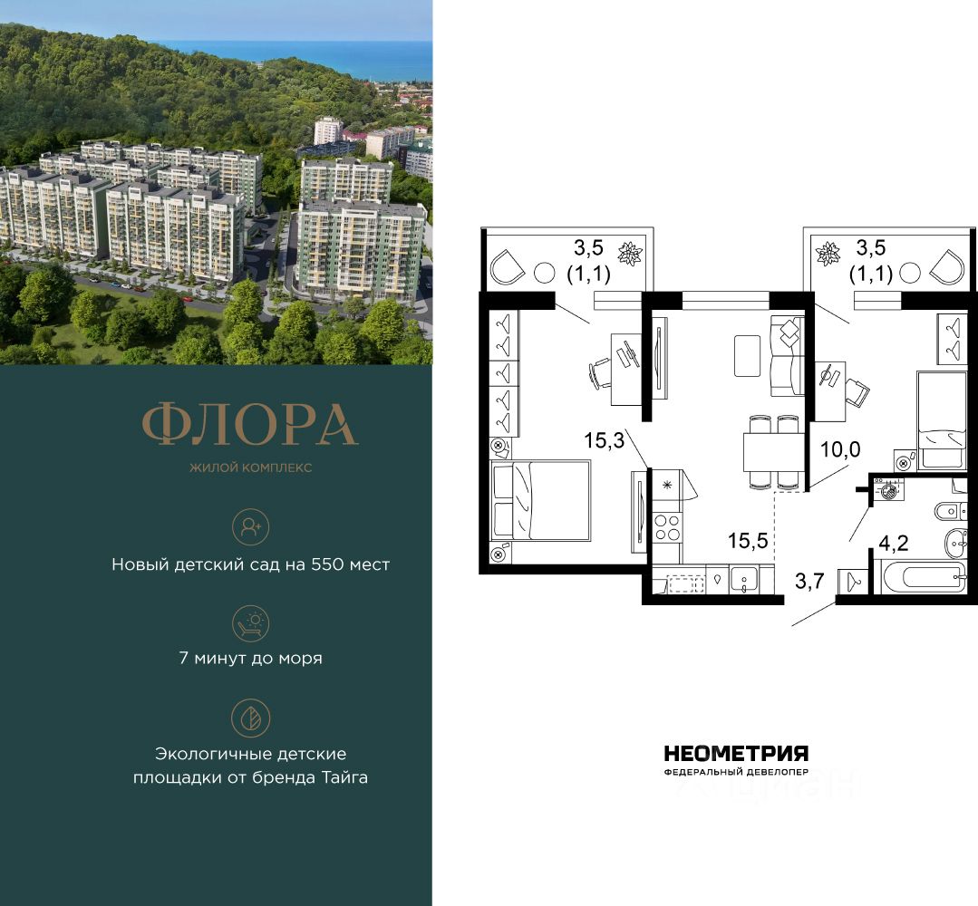 Продается квартира в ЖК "Флора" от федерального девелопера "Неометрия". Это жилой комплекс комфорт-класса в самом зеленом районе Сочи. При проектировании постарались максимально сохранить окружающую флору и фауну. Теплое море, горы, целебные источники, река, близость заповедника все это уже рядом с вами.
