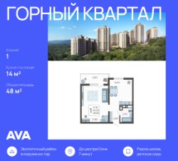 Продается 1-комнатная квартира в доме (Литер 6), срок сдачи : 3 кв. 2026, общей площадью 48 кв.м., на 14 этаже в новом современном жилом комплексе в Сочи "Горный квартал", Хостинский район. Отличный вариант для инвестиций и жизни.