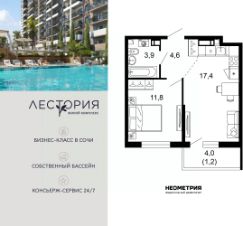 Продается квартира в жилом комплексе бизнес-класса "Лестория". В составе ЖК предусмотрена собственная аквазона площадью 473 квадратных метра с двумя подогреваемыми бассейнами, что соответствуют стандартам бизнес-класса.