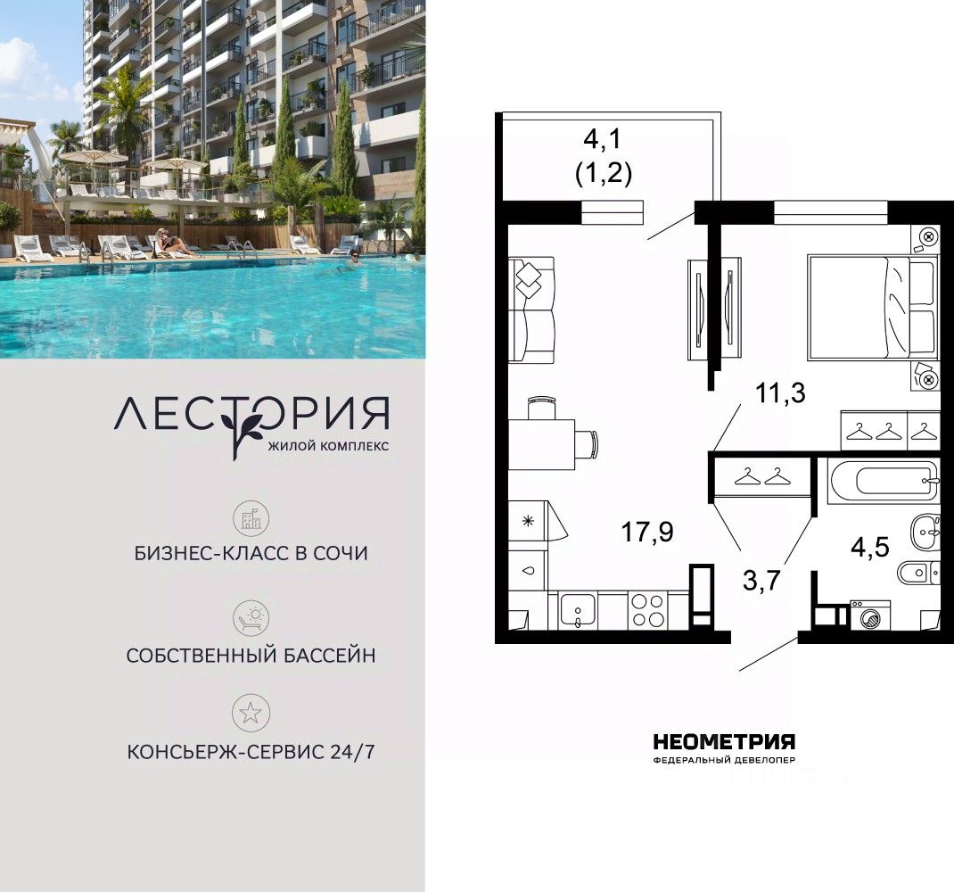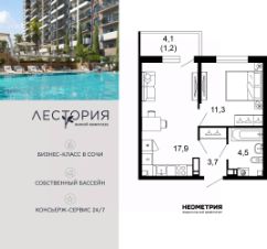Продается квартира в жилом комплексе бизнес-класса "Лестория". В составе ЖК предусмотрена собственная аквазона площадью 473 квадратных метра с двумя подогреваемыми бассейнами, что соответствуют стандартам бизнес-класса.