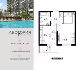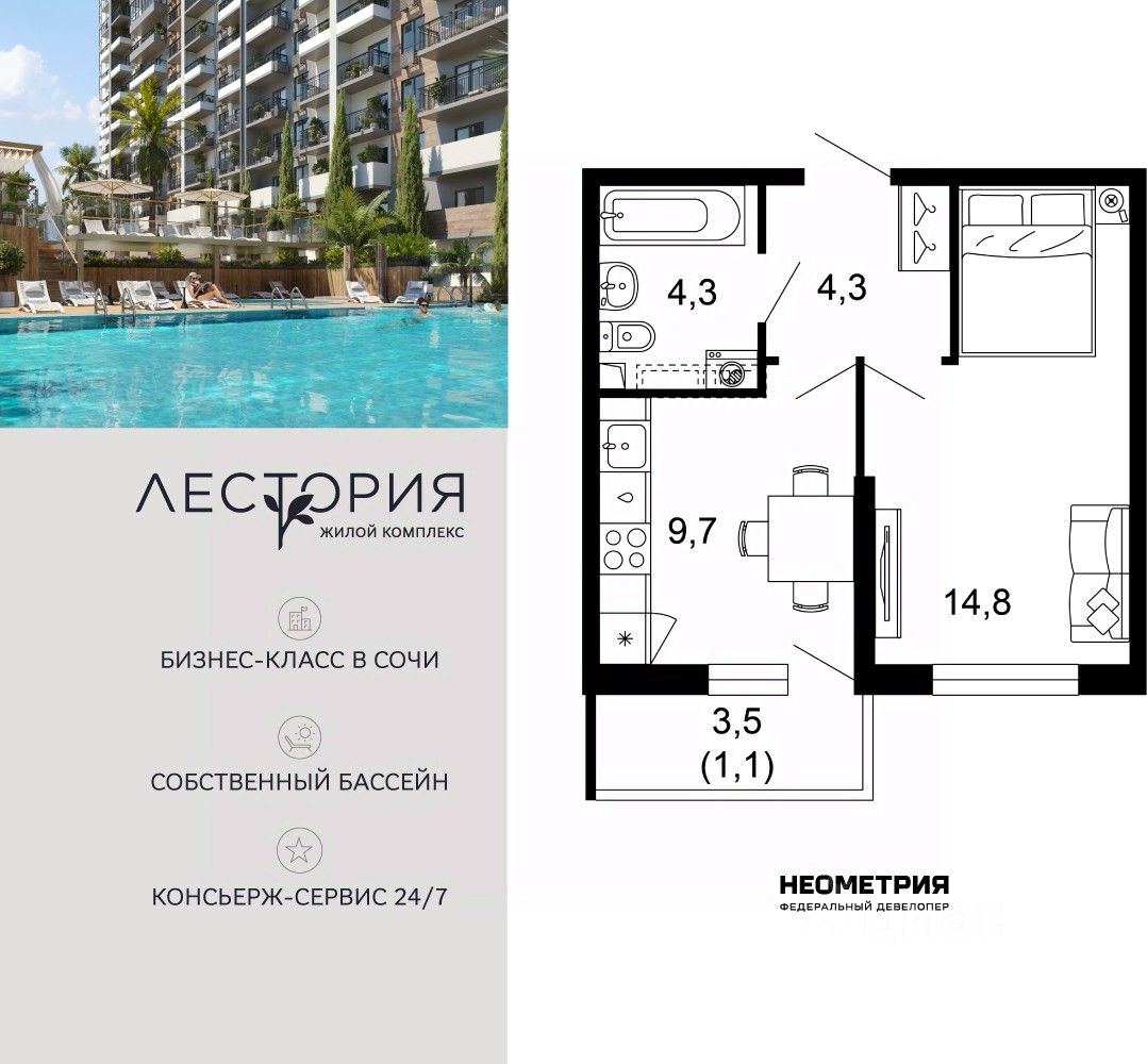 Продается квартира в жилом комплексе бизнес-класса "Лестория". В составе ЖК предусмотрена собственная аквазона площадью 473 квадратных метра с двумя подогреваемыми бассейнами, что соответствуют стандартам бизнес-класса.