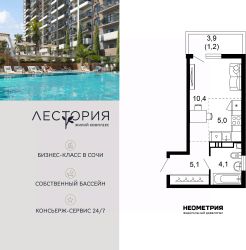 Продается квартира в жилом комплексе бизнес-класса "Лестория". В составе ЖК предусмотрена собственная аквазона площадью 473 квадратных метра с двумя подогреваемыми бассейнами, что соответствуют стандартам бизнес-класса.