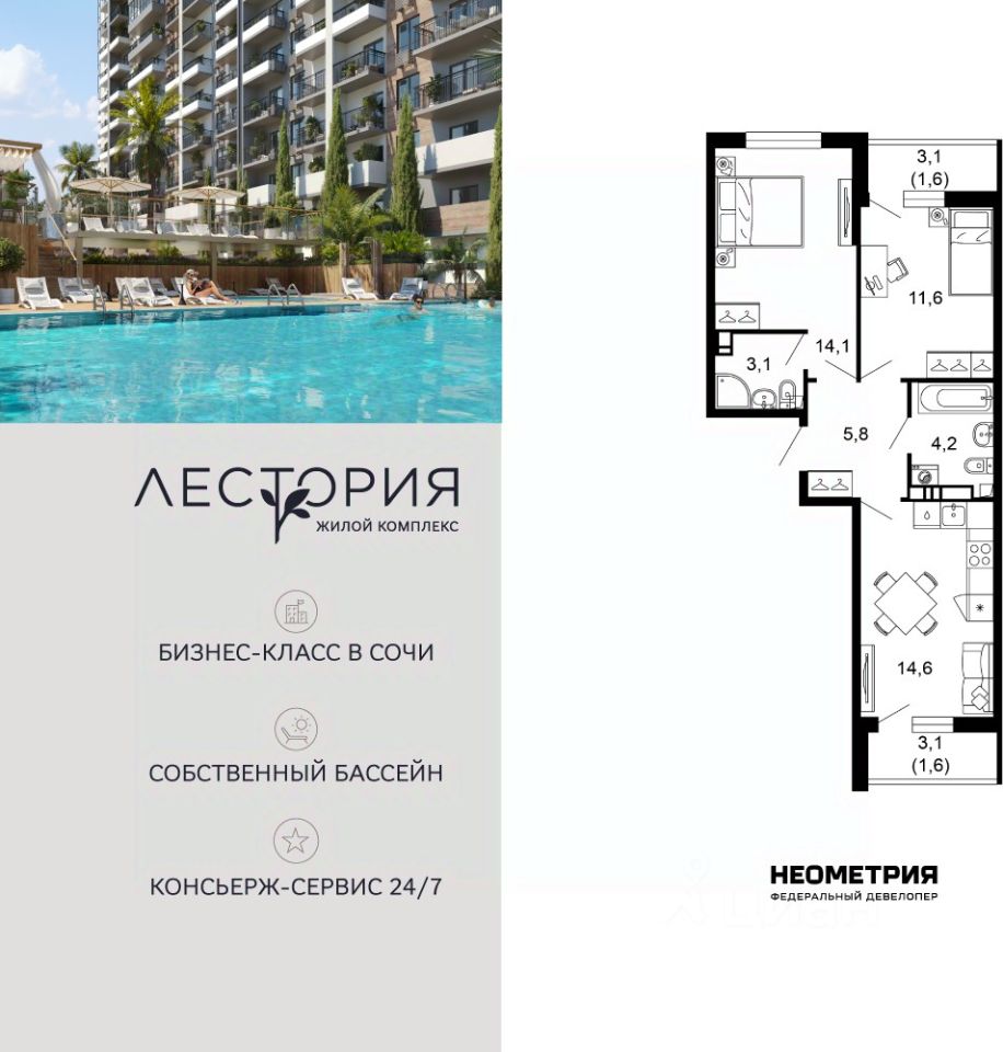 Продается квартира в жилом комплексе бизнес-класса "Лестория". В составе ЖК предусмотрена собственная аквазона площадью 473 квадратных метра с двумя подогреваемыми бассейнами, что соответствуют стандартам бизнес-класса.
