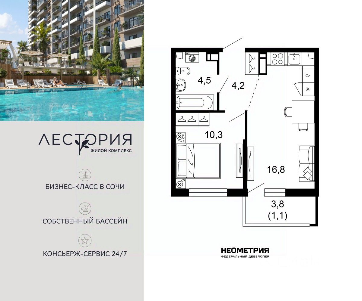 Продается квартира в жилом комплексе бизнес-класса "Лестория". В составе ЖК предусмотрена собственная аквазона площадью 473 квадратных метра с двумя подогреваемыми бассейнами, что соответствуют стандартам бизнес-класса.