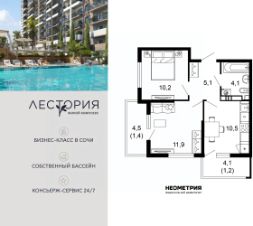 Продается квартира в жилом комплексе бизнес-класса "Лестория". В составе ЖК предусмотрена собственная аквазона площадью 473 квадратных метра с двумя подогреваемыми бассейнами, что соответствуют стандартам бизнес-класса.