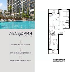 Продается квартира в жилом комплексе бизнес-класса "Лестория". В составе ЖК предусмотрена собственная аквазона площадью 473 квадратных метра с двумя подогреваемыми бассейнами, что соответствуют стандартам бизнес-класса.