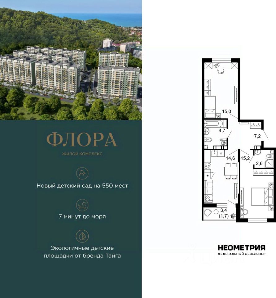 Продается квартира в ЖК "Флора" от федерального девелопера "Неометрия". Это жилой комплекс комфорт-класса в самом зеленом районе Сочи. При проектировании постарались максимально сохранить окружающую флору и фауну. Теплое море, горы, целебные источники, река, близость заповедника все это уже рядом с вами.