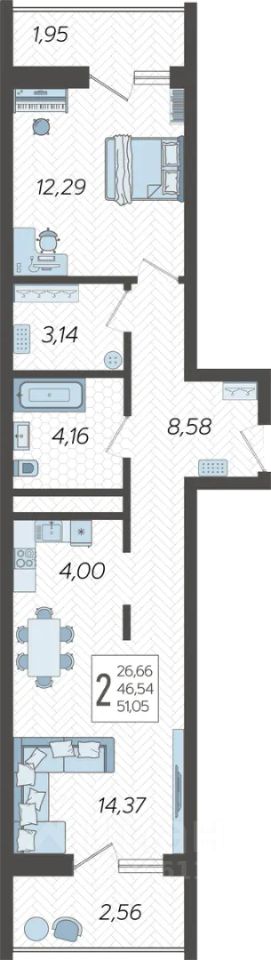 Продаётся 2-комнатная квартира в строящемся доме (Корпус 14), срок сдачи: I-кв. 2026, общей площадью 51.05 кв.м., на 4 этаже. Жилой комлекс "Кислород" представляет комплексную застройку, состоящую из 20-ти этажных монолитных домов.