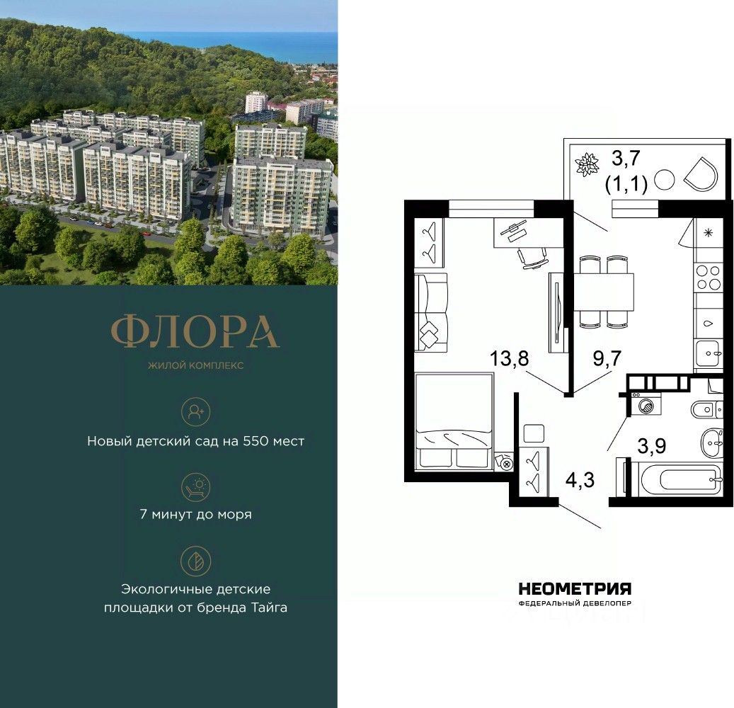 Продается квартира в ЖК "Флора" от федерального девелопера "Неометрия". Это жилой комплекс комфорт-класса в самом зеленом районе Сочи. При проектировании постарались максимально сохранить окружающую флору и фауну. Теплое море, горы, целебные источники, река, близость заповедника все это уже рядом с вами.