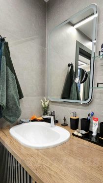 Квартира полностью обставлена дорогой мебелью, качественной техникой, европейской сантехникой и интерьерным освещением. Теплые полы и кондиционер в каждой комнате. Очень удобная планировка (евродвушка) - отдельная спальня, кухня-гостиная, большая гардеробная комната и санузел. Строилась под себя, в идеальном состоянии, никогда не сдавалась и не сдается. С балкона открывается прекрасный вид на море.