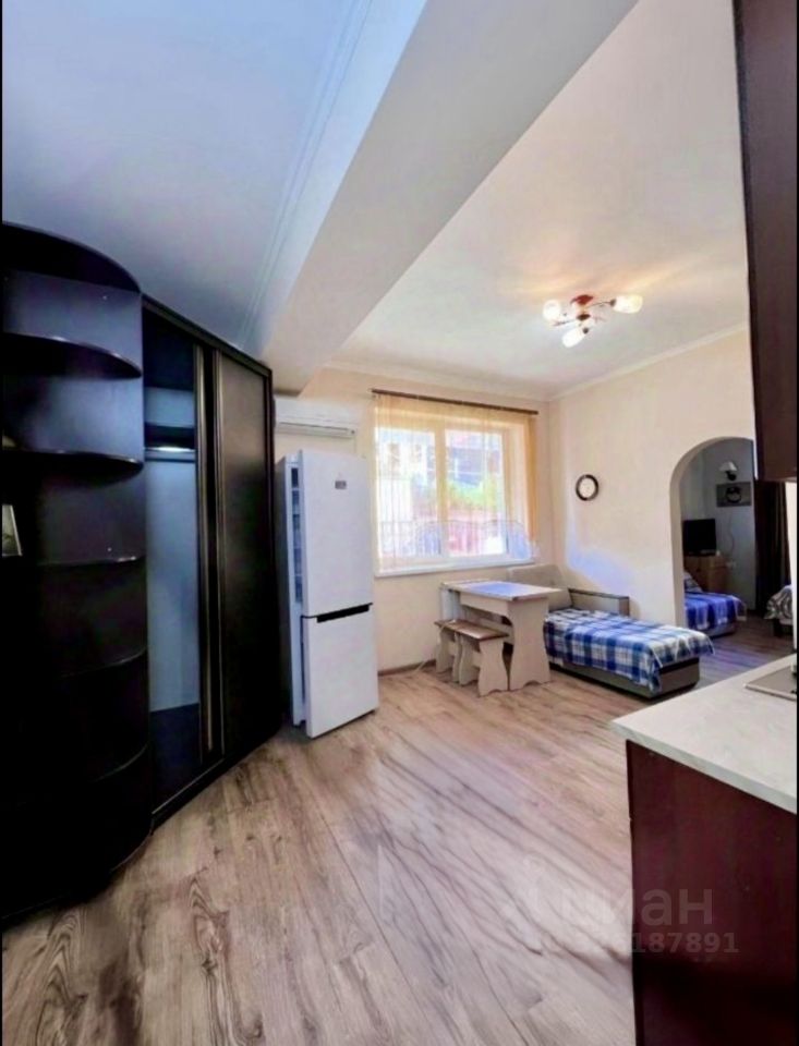 Кухня совмещена с гостиной и оснащена деревянной мебелью, встроенной техникой, включая холодильник.