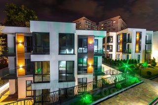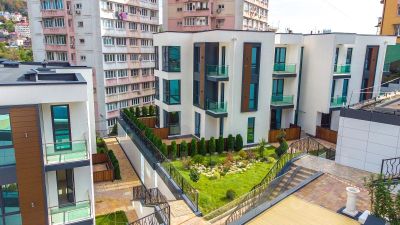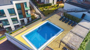 Комплекс из трех компактных домов с бассейном , детской и спортивной площадками.