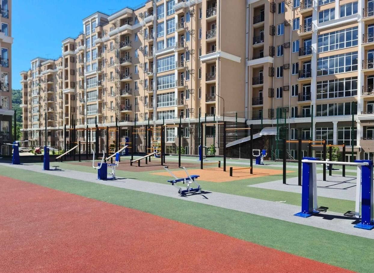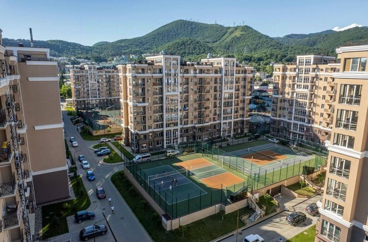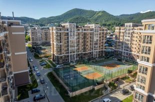 Сзади комплекса расположены горы, Крабовое ущелье, национальный парк Сочи, вид с квартиры как раз на эти шикарные горы, идти 15 минут пешком. Каждый сезон горы обретают свои краски и пейзаж, летом это зеленые краски, осенью яркие желтые и оранжевые тона, зимой виды на шапки снега на вершине гор.
