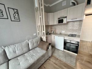Пространство квартиры организовано максимально эффективно: кухонная зона, раскладной двухспальный диван, стол, большой шкаф-купе, спальное место на втором ярусе, совмещённый санузел обеспечивает комфортное использование, а вид из окон с 7 этажа на тихий двор создаёт атмосферу спокойствия и уюта.