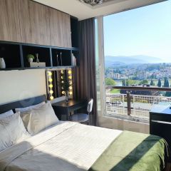 Уникальность этой квартиры заключается в ее неповторимом месторасположении. Из панорамных окон открывается захватывающая дух панорама: слева видны снежные вершины Кавказских гор, прямо перед вами — величественные объекты Олимпийского парка, а вдали в ясную погоду просматриваются очертания Абхазии. Внизу течет горная река Мзымта, а под окнами кипит жизнь с рынками, ресторанами и магазинами. С другой стороны дома открывается вид на морпорт, парки и центр Сочи. Каждое утро здесь начинается с восхода солнца из-за гор и пения птиц, а вечера наполнены огнями ночного города.