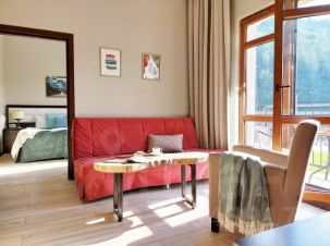 2 спальни, кухня-гостиная , два санузла , балконы в сторону главной площади и с потрясающим видом на горы.