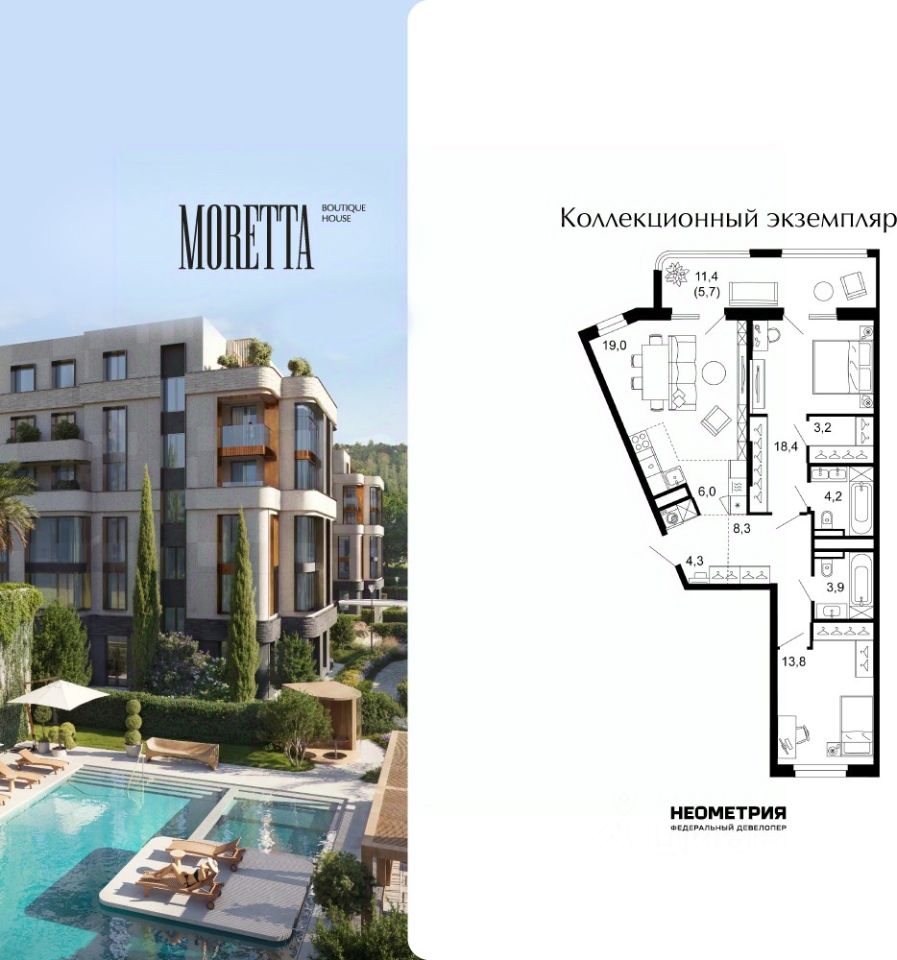 MORETTA— первый и единственный премиальный жилой комплекс Сочи бутикового формата. Коллекционный дом воплощает идею тайного места роскошной безмятежности, где индивидуальный подход ощущается в каждой детали: камерной локации и подчеркнутой приватности, лимитированном числе резиденций, архитектуре и уникальном окружении, клубных привилегиях и культуре сервиса.