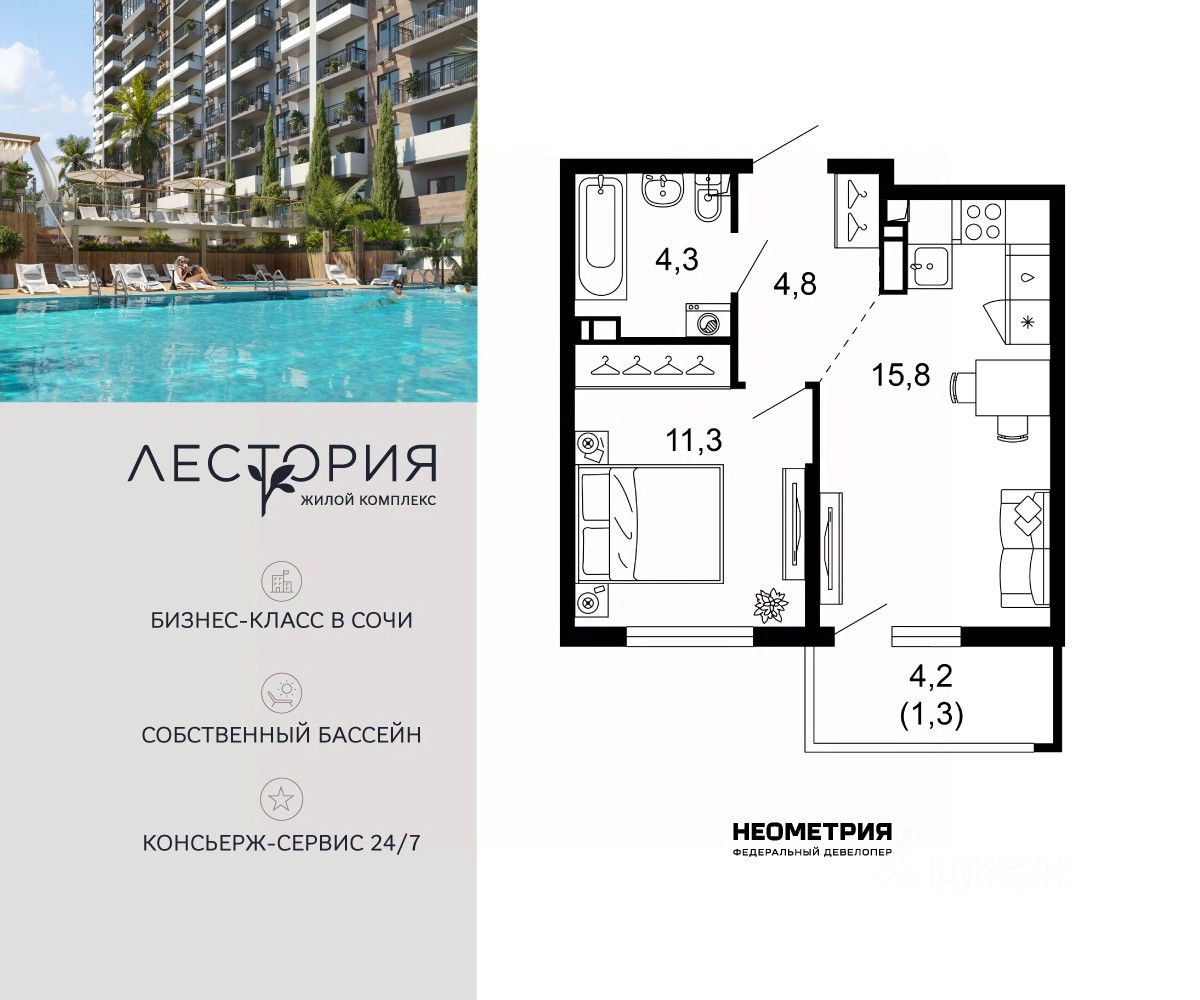 Продается квартира в жилом комплексе бизнес-класса "Лестория". В составе ЖК предусмотрена собственная аквазона площадью 473 квадратных метра с двумя подогреваемыми бассейнами, что соответствуют стандартам бизнес-класса.