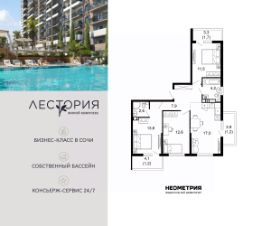 Продается квартира в жилом комплексе бизнес-класса "Лестория". В составе ЖК предусмотрена собственная аквазона площадью 473 квадратных метра с двумя подогреваемыми бассейнами, что соответствуют стандартам бизнес-класса.