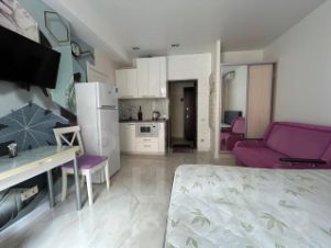 Интерьер студии оформлен в светлых тонах, с качественным ремонтом — чисто, аккуратно и уютно. Весь необходимый комплект мебели и техника остаются новому владельцу, что делает студию готовой к полноценному проживанию. Объект можно сдавать в аренду как на длительный срок, так и посуточно, что подчеркивает его инвестиционную привлекательность.