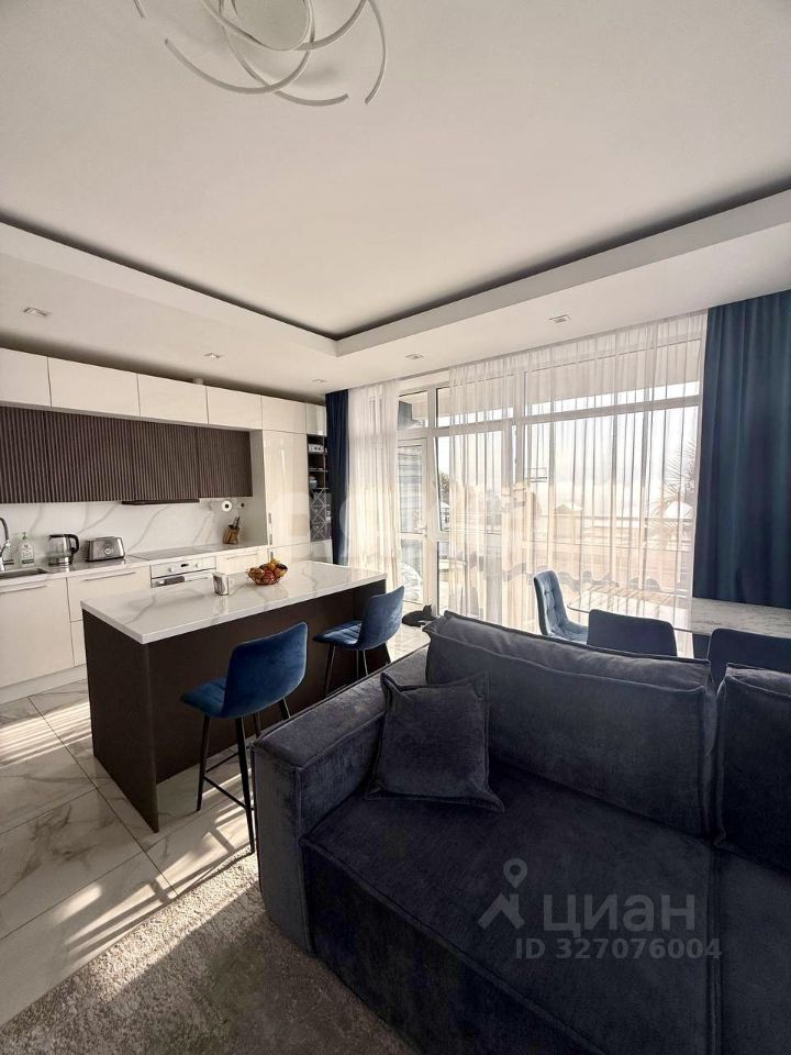 Планировка включает: кухню-гостиную, мастер-спальню, гардеробная, две детские спальни, общий санузел с огромной душевой, холл и три лоджии с видом на море.