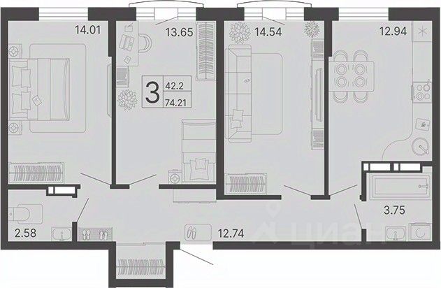 Общая площадь74,21 м²