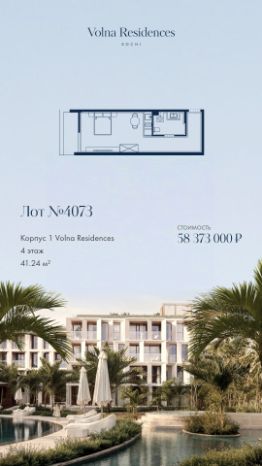Продаётся 1-комнатная квартира в строящемся доме (Дом 1 ), срок сдачи: II-кв. 2028, общей площадью 41.24 кв.м., на 4 этаже. Volna Residence - это комплекс для жизни на территории комплекса Volna, объединённый с отелем общей концепцией и инфраструктурой. 3 малоэтажных корпуса на 520 номеров расположены на первой береговой линии и имеют собственный бассейн. Территория комплекса Volna - 7,2 га. Более половины этой территории занимает парк и инфраструктура для жизни и отдыха.