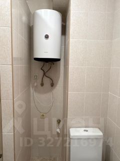 аккуратная душевая туалетом и тумбочкой, зеркалом и водонагревателем.