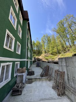 Планируется в две спальни и кухню. У одной из них балкон выходит на лес.