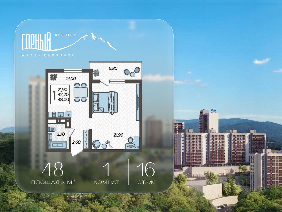 В продаже 1-комнатная квартира площадью 48, расположенная Литер 6 жилого комплекса комфорт+ класса "Горный квартал". Комплекс от девелопера AVA находится в Сочи, Хостинского района, в 15 минутах езды от центра города.
