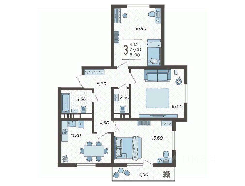 Видовые квартиры с окнами на три стороны света и семейные форматы с тремя спальнями, двумя ванными и отдельной кухней;