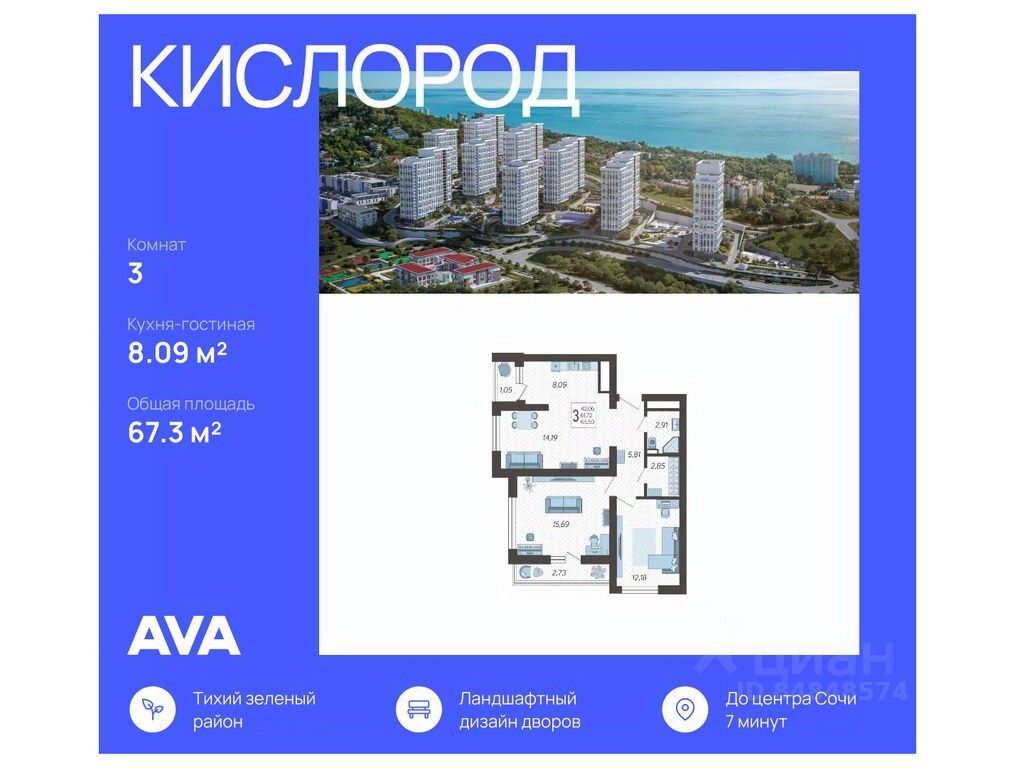 В продаже 3-комнатная квартира, площадью 67.3, расположенная Литер 5 жилого комплекса бизнес-класса "Кислород". Комплекс от девелопера AVA находится в Сочи, на северном склоне горы Бытха, в 7 минутах езды от центра города.