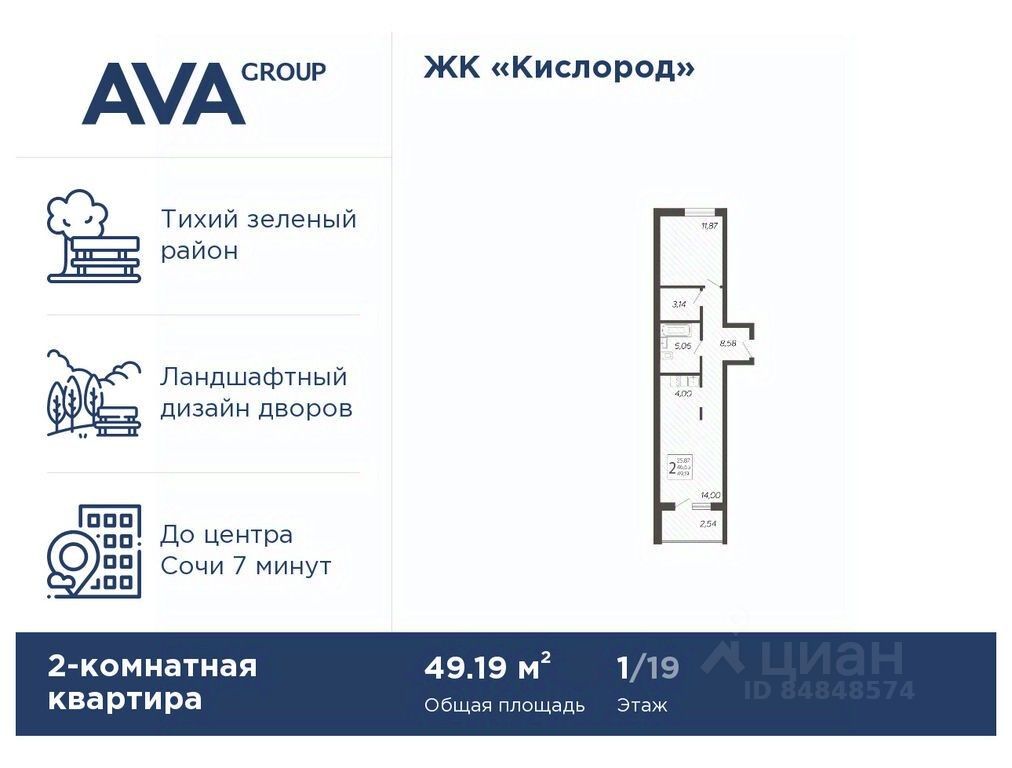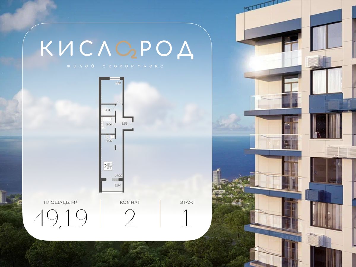 В продаже 2-комнатная квартира, площадью 49.19, расположенная Литер 9 жилого комплекса бизнес-класса "Кислород". Комплекс от девелопера AVA находится в Сочи, на северном склоне горы Бытха, в 7 минутах езды от центра города.