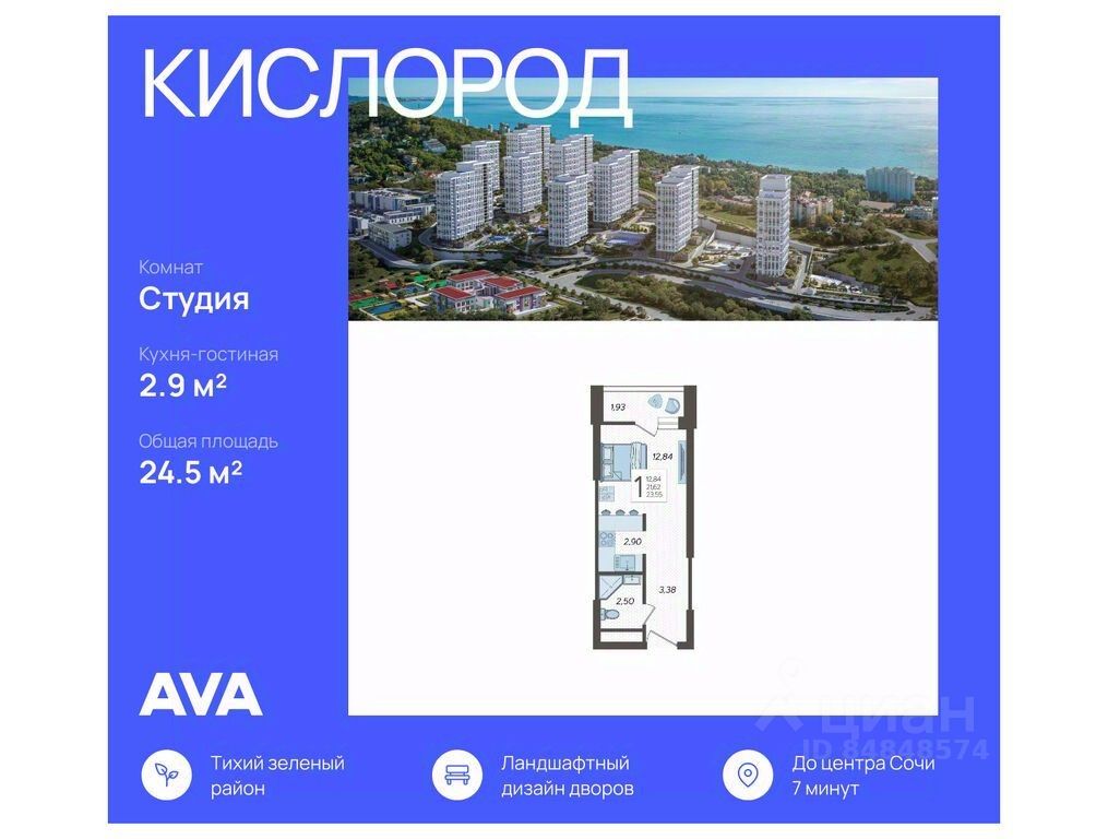 В продаже студия, площадью 24.5, расположенная Литер 2 жилого комплекса бизнес-класса "Кислород". Комплекс от девелопера AVA находится в Сочи, на северном склоне горы Бытха, в 7 минутах езды от центра города.