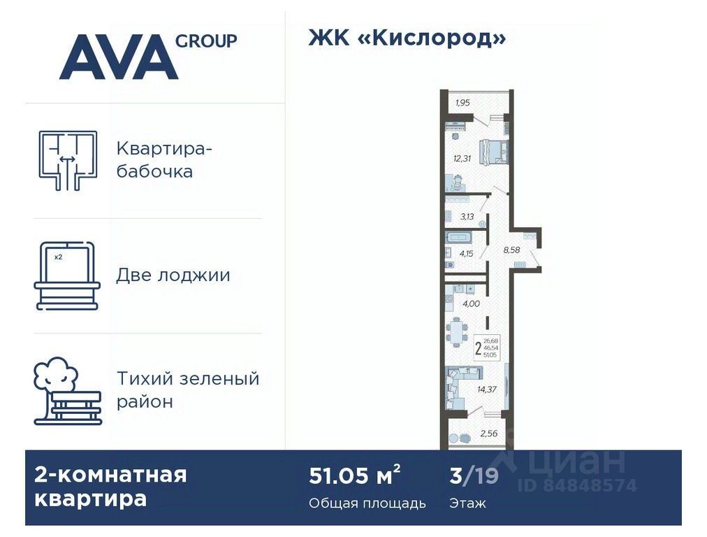 В продаже 2-комнатная квартира, площадью 51.05, расположенная Литер 14 жилого комплекса бизнес-класса "Кислород". Комплекс от девелопера AVA находится в Сочи, на северном склоне горы Бытха, в 7 минутах езды от центра города.