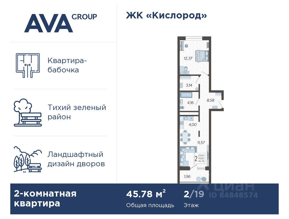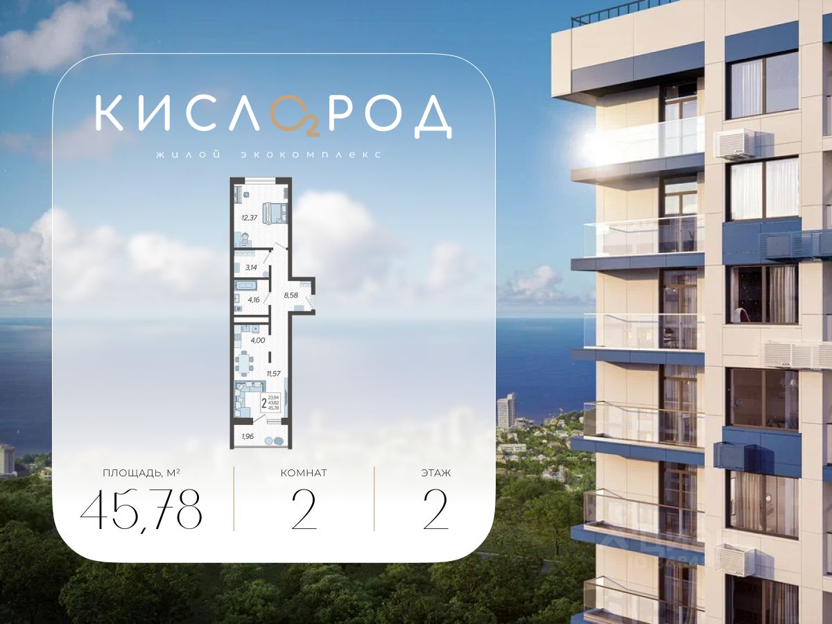 В продаже 2-комнатная квартира, площадью 45.78, расположенная Литер 14 жилого комплекса бизнес-класса "Кислород". Комплекс от девелопера AVA находится в Сочи, на северном склоне горы Бытха, в 7 минутах езды от центра города.