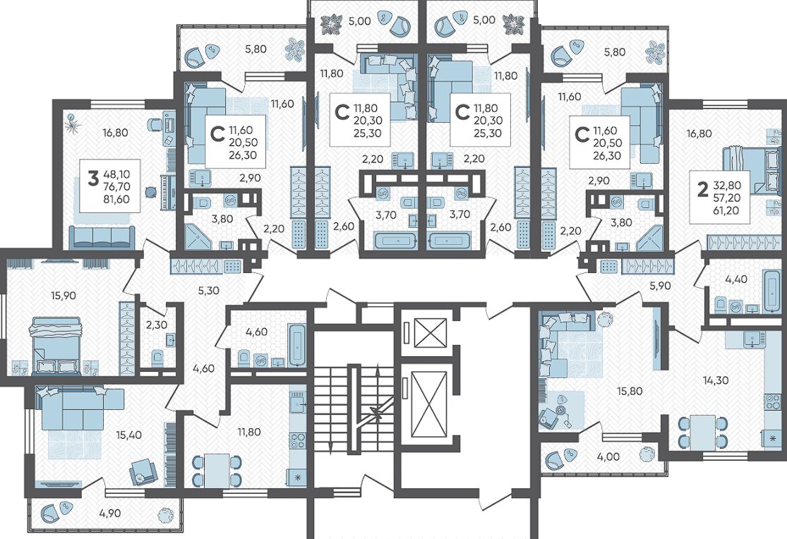 Видовые квартиры с окнами на три стороны света и семейные форматы с тремя спальнями, двумя ванными и отдельной кухней;