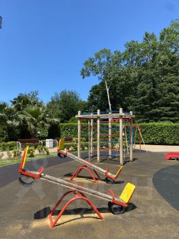 В комплексе есть огромный бассейн, теннисный корт, волейбольное поле, воркаут площадка, тренажеры, мангальная зона, смотровые площадки и несколько детских площадок. Огромная ухоженная зелёная территория комплекса с зоной парковки+подземная парковка , охраняемая территория с 2-мя кпп. За комплексом начинается зелёная заповедная зона. Рядом три санатория Знамя и Южный, Бургас, где можно провести время в открытом и закрытом бассейнах, пройти оздоровительные процедуры.